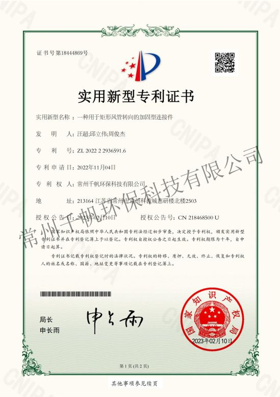 實用新型專利證書 一種用于矩形風管轉向的加固型連接件